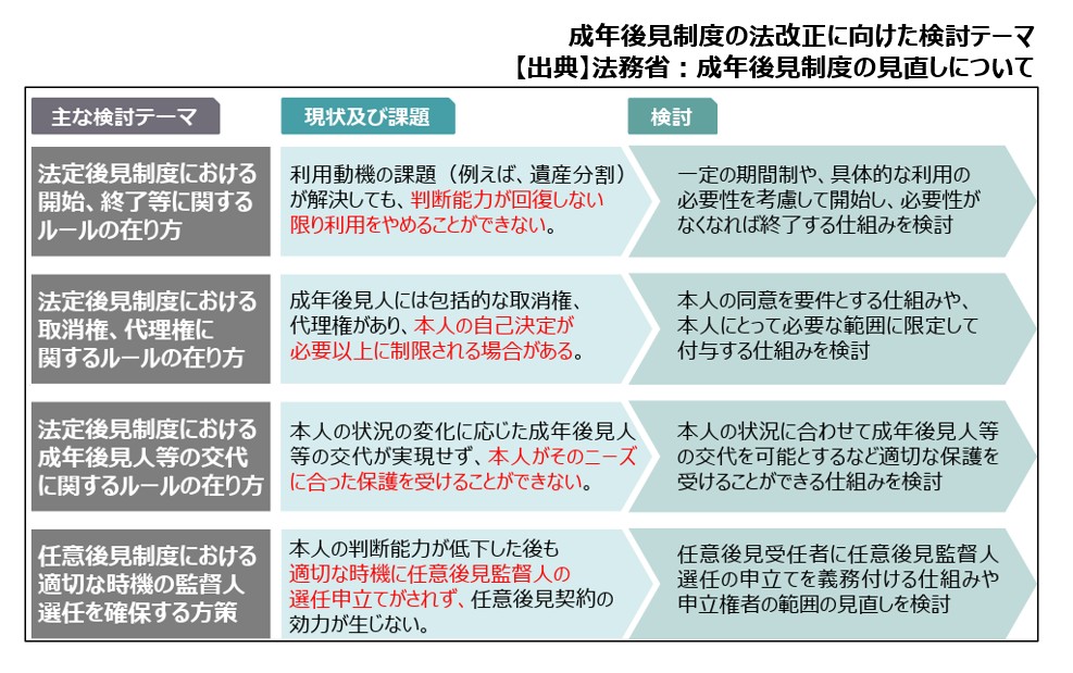 この点については、法改正も含めて議論されており、2024年以降、柔軟な終了や段階的後見制度の導入に向けた法改正の検討が