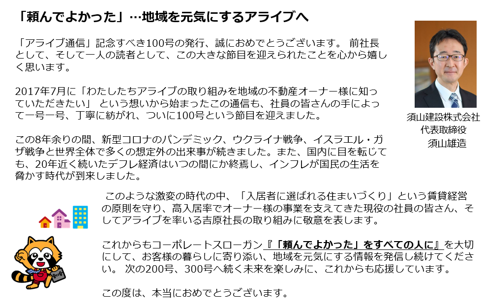 vol.229 「頼んでよかった」…地域を元気にするアライブへ/特別寄稿 ~オーナーズヴォイス~/アライブ通信100号の発行にあたり/アライブ活動のご報告