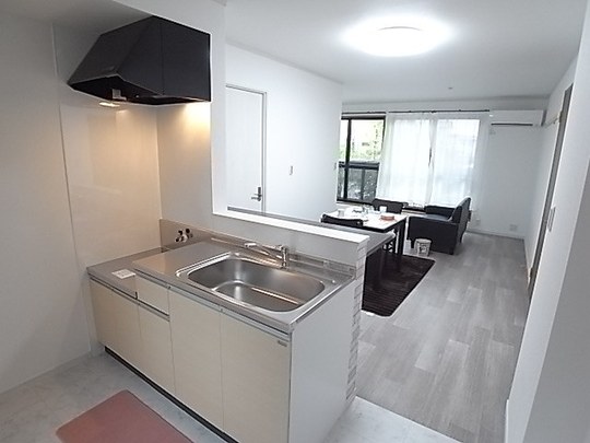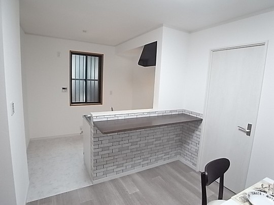 壁面キッチンを対面式カウンターキッチンへ変更。椅子が2脚入るカウンターはおしゃれな