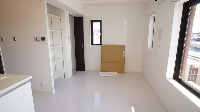 ワンルームの角部屋(101号室)の内装です。モノトーンを基調とした室内は、どのようなインテリアにもマッチします♪