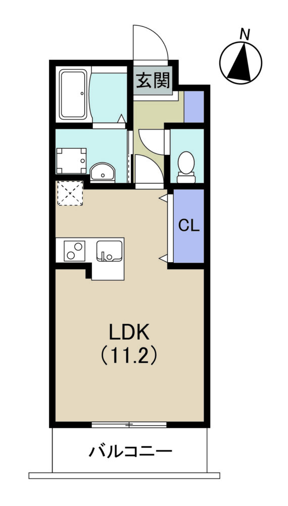 お部屋は広々1R(11.2帖)。2026年完成の明るい内装で、システムキッチン・浴室乾燥機・温水洗浄便座・独立洗面台など、ワンランク上の設備が揃っています。