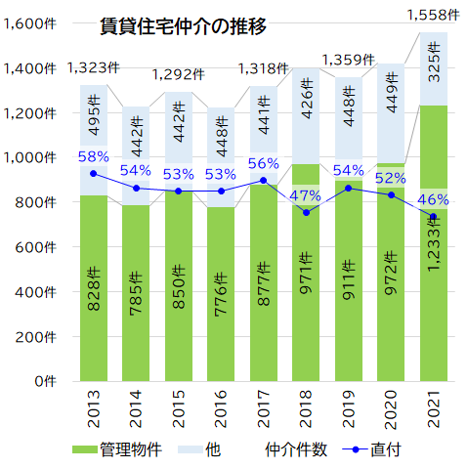 ・又、仲介全体の内、直付率 (お客様がアライブでお部屋探し・ご契約) は年々微減しています。