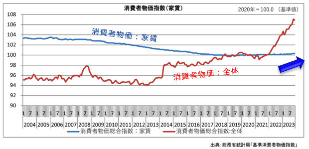 パッと見では、物価全体が上昇する中、家賃は微減・横這いに見えますが